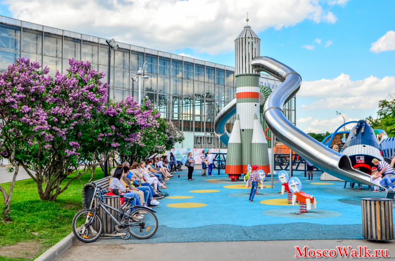 На игровой площадке представлены игровые модели космических кораблей и ракет. Он расположен рядом с музеем космического корабля «Буран», который раскрывает всю космическую тематику. Все обычные аттракционы превращаются в более привлекательные, например, горки, прикрепленные к модели автомобилей «Прогресс» и «Восток», которая также оснащена сетчатым туннелем, соединяющим их, по которому дети могут проползать, чтобы двигаться друг от друга. Кроме того, дети могут попробовать управлять искусственным спутником Земли, капсульным кораблем и луноходом. Удивительно то, что все элементы детской площадки изготовлены из экологически чистых и прочных материалов, что делает эту площадку одной из лучших детских площадок в Москве.