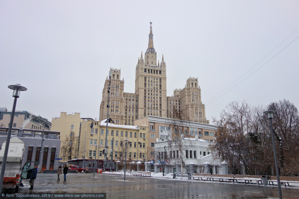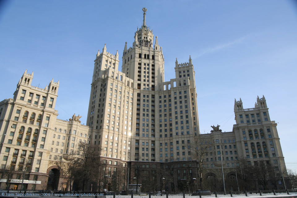 Иногда говорят, что высотку на Котельнической набережной начали строить раньше остальных. Это не совсем так. Действительно, первый 9-этажный жилой корпус появился на месте впадения Яузы в Москву-реку еще в конце 1930-х. Однако его строительство не связано с проектом восьми высоток, которые стали отложенным подарком на 800-летие Москвы лишь в 1947 году.