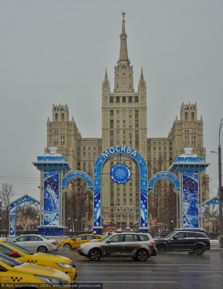 Высотку спроектировали Михаил Посохин и Ашот Мндоянц. В центральной секции 33 этажа, максимальная высота — 156 метров (вместе со шпилем). Здание обладает мощным стилобатом, облицованным гранитом: обходя здание вокруг, вы оказываетесь на много метров ниже входов в подъезд.