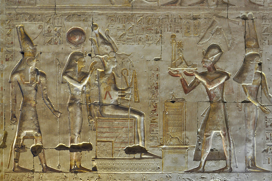 Практически все стены древнеегипетских храмов были покрыты рельефными изображениями, выступающими над поверхностью стены (барельеф, самая тонкая и требующая большого количества времени техника), углублёнными в неё (врезанный рельеф) или с высеченными в камне контурами (самый быстрый и простой способ). Фигуры размещались рядами – ярусами, или регистрами, которые принято нумеровать снизу вверх. Дверные притолоки часто украшались изображениями крылатого солнечного диска, символизирующего единство Двух Земель; геральдические растения Верхнего и Нижнего Египта также являлись распространённым декоративным мотивом.