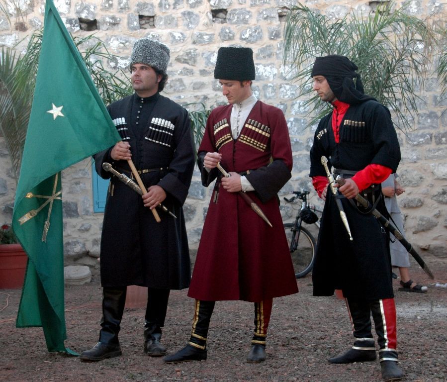 Носили черкеску поверх бешмета с высоким воротником, который обычно виднелся в широком вырезе. Он плотно облегал тело до талии, а ниже плавно расширялся, чем подчеркивал стройность стана джигита. Бешмет застегивали на «узелки» и петли.
