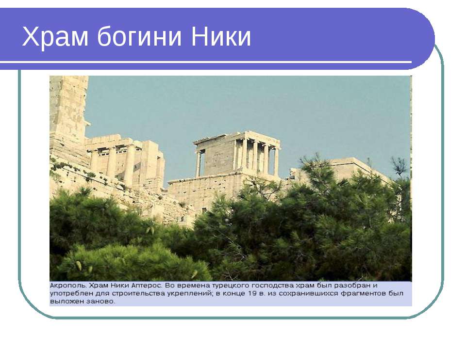 В праздничные дни торжественные процессии поднимались на Акрополь. Его сооружения открывались взорам приближающихся афинян одно за другим. Возле самого входа их встречал маленький храм Ники Бескрылой. Ника — богиня победы, её было принято изображать крылатой. Но афиняне хотели, чтобы она никогда не улетала от них. Когда процессия шла мимо храма, перед ней открывался вид на Пропилеи — колоннаду, оформляющую вход на Акрополь.