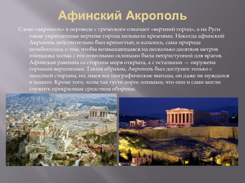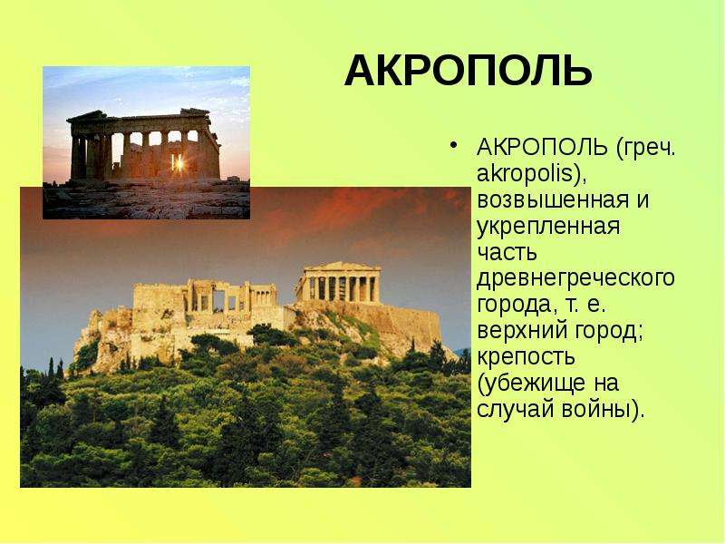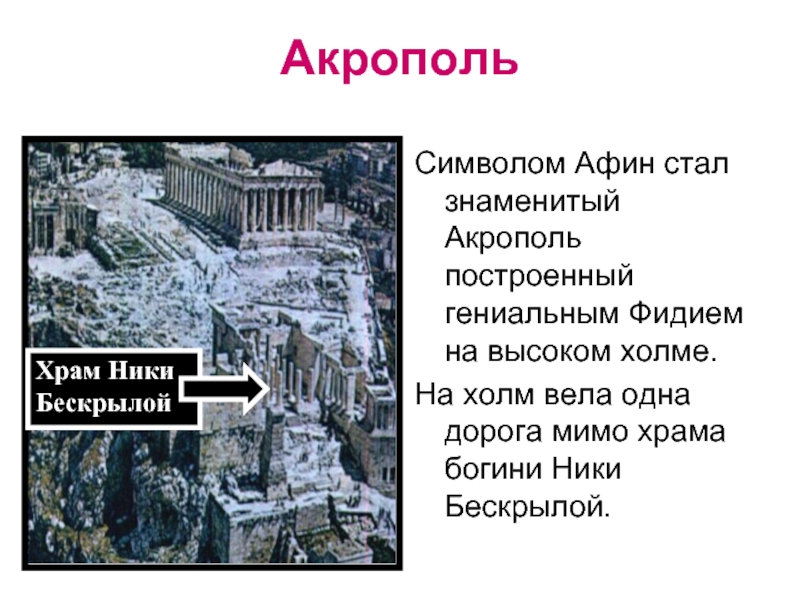 до н.э. лучшими архитекторами Эллады. Изначально он предназначался не столько для обороны города, сколько для проведения языческих богослужений. На его территории было возведено огромное количество храмов, посвящённых Афине (наиболее известный Акрополь Парфенон), а также Посейдону и Нике.