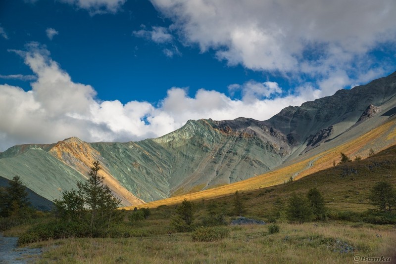 Подъем к перевалу довольно пологий, нет скал и резких перепадов высот, тем ни менее место очень красивое. Вначале мы остановились у озера Киделю, оно совсем рядом, чуть ниже перевала. Снежные вершины Курайского хребта, кедры и лиственницы очень живописно отражаются в зеркальной глади озера. Берега озера болотистые, если захотите подойти поближе — ступайте осторожно... или не исполнят).