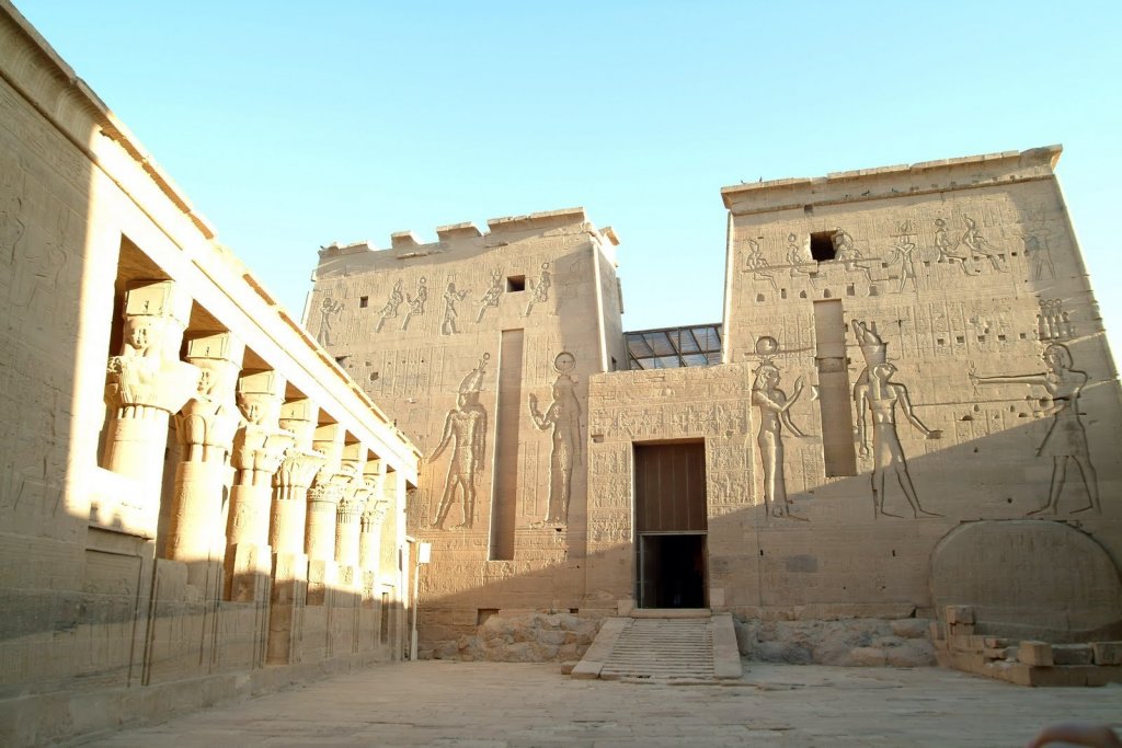 Самый большой и самый важный храм на Филе — великий Храм Исиды, ориентированный с юга на север. Это был центр богини Исиды и ее связи с Осирисом, Гором и царством во время птолемеевского периода египетской истории. С Филами связано много легенд, но самая известная из них рассказывает о том, как Исида нашла здесь сердце Осириса после его убийства своим братом Сетом. Строительство Храма Исиды началось во время правления царя Птолемея 2. Другие цари-Птолемеи внесли свой вклад, добавив дополнительные части к главному храму. Храм Исиды состоит из 1-го пилона (45,5 м в ширину и 18 м в высоту), который представляет собой большой традиционный пилон с двумя башнями, и центрального дверного проема, который ведет к 2 и Пилон. Слева от этого двора находится Мамисси, в котором есть сцены, изображающие рождение Бога Гора его матерью Исидой. Восточная колоннада недостроена, завершено только 6 из 16 колонн. Остальные грубо обтесаны с незаконченными капителями. В задней стене восточной колоннады пять дверей, которые вели в различные часовни. Западная колоннада имеет длину 93 м и имеет 31 (первоначально 32) растительные колонны (5,1 м) высотой с капителями различных форм. От колоннады подземная лестница ведет вниз к небольшому Нилометру. Пилон 2 nd (32 м в ширину и 12 м в высоту) ведет в Гипостильный зал с 10 огромными колоннами, которые символизируют первые растения, деревья и цветы Земли, которые начали расти на Первобытном Кургане ( символизируется полом храма).