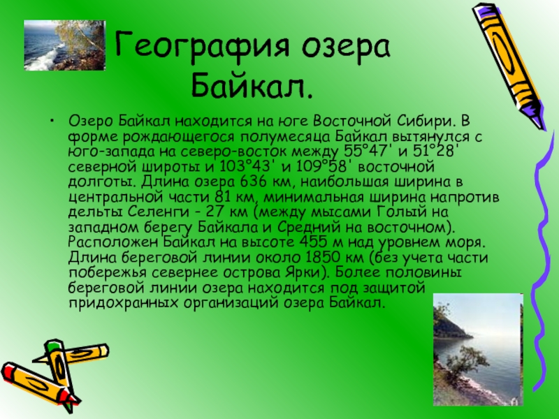 Расположенный на юге центральной части Сибири, Байкал имеет длину 636 километров (395,2 мили), ширину 80 километров (49,71 мили) и глубину 1637 метров (5 371 фут). Водораздел 55000 гектаров (212,4 квадратных миль) питает озеро более чем тремя сотнями рек. Только река Ангара впадает в Байкал, текущую на северо-запад от южной оконечности озера. Озеро, вероятно, начало формироваться около 25 миллионов лет назад на месте тектонического разлома. Разлом продолжает расширяться, и в глубине озера появляются термальные источники.