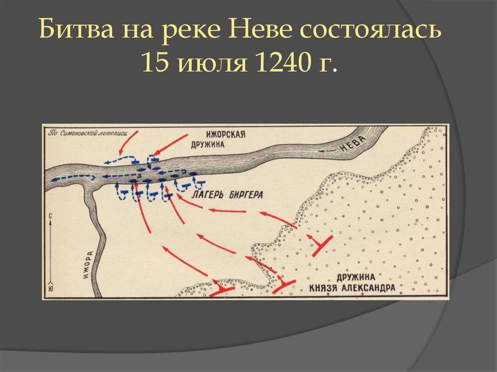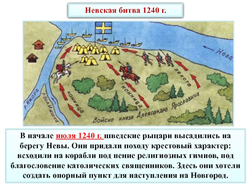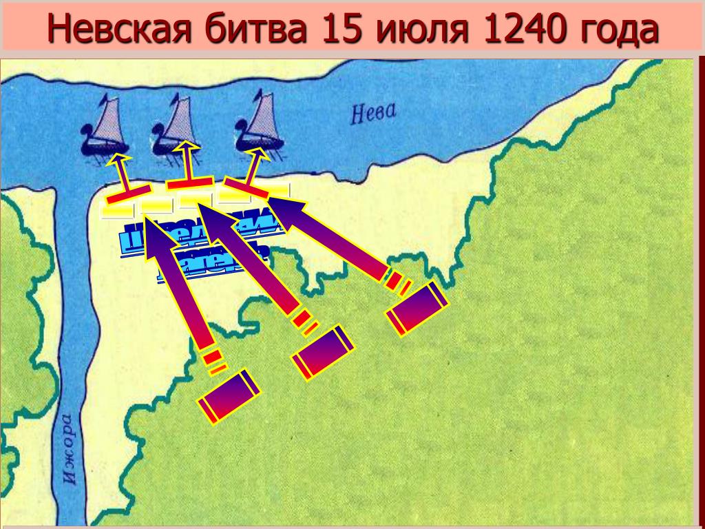 В летописном рассказе о Невской битве явно воссоздан план Александра.Удар пешего отряда по Неве отрезал шведов от кораблей, а кавалерия, действуя с суши через центр лагеря, должна была загнать противника в угол, образованный берегами Ижоры и Невы. , замкни окружение и уничтожь врага.