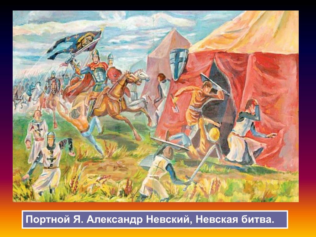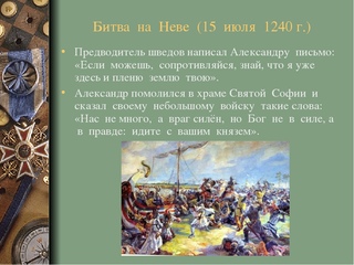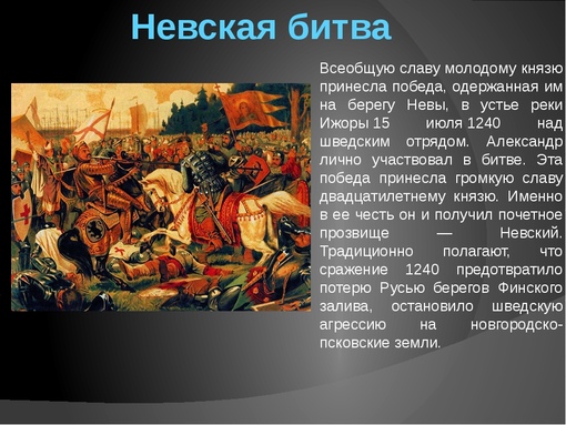 Невская битва — сражение между русскими и шведскими войсками на реке Неве. Целью вторжения шведов был захват устья реки Невы, что давало возможность овладеть важнейшим участком пути «из варяг в греки», находившимся под контролем Великого Новгорода. Воспользовавшись туманом, русские неожиданно напали на шведский лагерь и разгромили врага; только наступление темноты прекратило битву и позволило спастись остаткам шведского войска Биргера, который был ранен Александром Ярославичем. Князь Александр Ярославич за проявленное в битве полководческое искусство и мужество был прозван Невским. Военно-политическое значение Невской битвы состояло в предотвращении угрозы вражеского нашествия с севера и в обеспечении безопасности границ России со стороны Швеции в условиях Батыева нашествия.