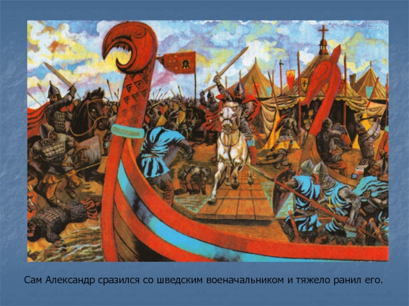 Сам Александр, согласно летописям, ранил шведского военачальника ярла Биргера: возложил «печать на лице острым своим копием». Князь Александр получил почетное прозвище Невского.шведы разгромлены русским войском под руководством Александра Ярославича в битве на реке Неве. Сам Александр, согласно летописям, ранил ярла Биргера – шведского военачальника. (Источник информации — портал История.РФ,