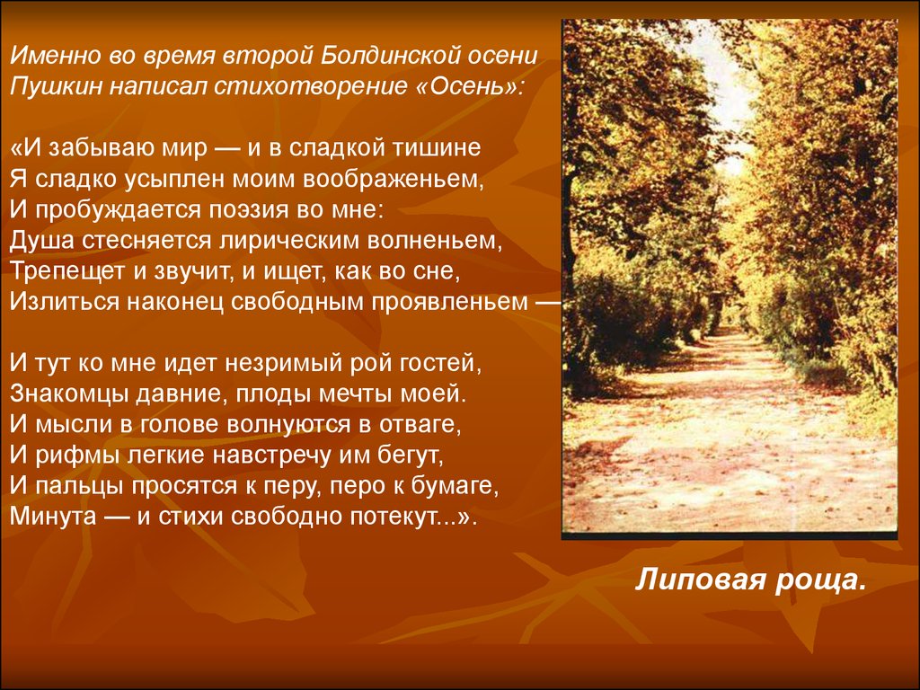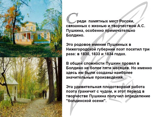 С. Пушкину. Этот период жизни и творчества поэта известен в истории как «Болдинская осень». Именно в это время Пушкин написал одни из самых выдающихся своих произведений.