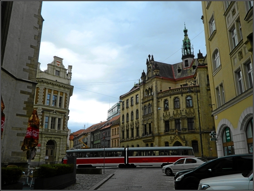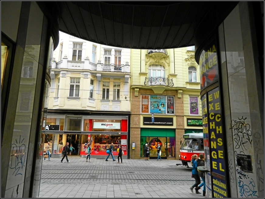 За площадью Свободы она переодит в улицу Rasinova. Очень часто в кадр попадают трамваи; в центре Брно это не то что основной, а наверное, единственный вид общественного транспорта.