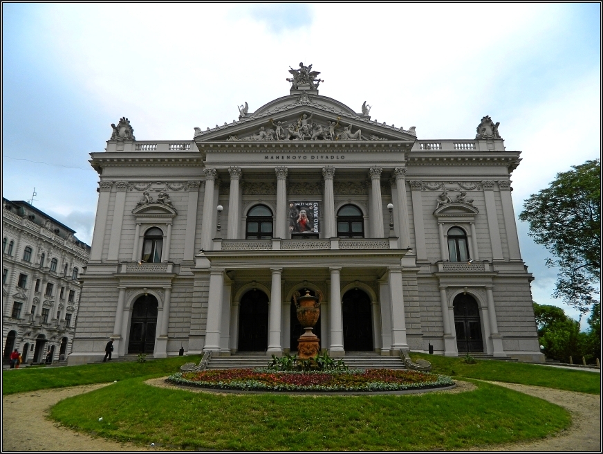 Театр имени Иржи Магена в центре Малиновской площади в БрноЭто здание со светлым фасадом выглядит лаконично, без особых изысков. Несмотря на кажущуюся простоту, треугольный фронтон в центральной части привлекает внимание скульптурным ансамблем, а изящные колонны делают облик здания легким, не отягощенным лишними элементами. Особые рекомендации туристов касаются интерьера, оформленного в барочном стиле. Вызывают восторг строгие мраморные колонны, расписанные фресками плафоны, обитые красным бархатом ложи и статуи атлантов, поддерживающие тяжелый занавес.