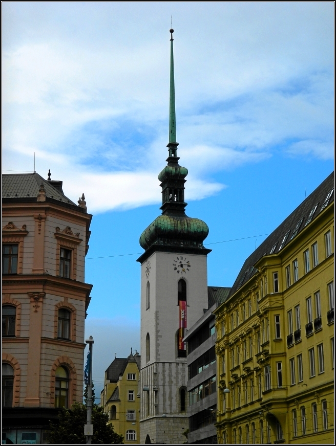 Костёл Святого Иакова XIII века на Якубской площади в центре БрноХрам постройки XIII в. выполнен в стиле поздней готики. Автор проекта, по-видимому, обладал интересным чувством юмора, что подтверждается оригинальной мужской фигуркой над южным окном. Внутри можно увидеть несколько надгробий историческим личностям, возле костела находится уникальная костница. В интерьере впечатляют витражные окна, колонны, стремящиеся ввысь, кафедра проповедника, расписанная библейскими сценами.