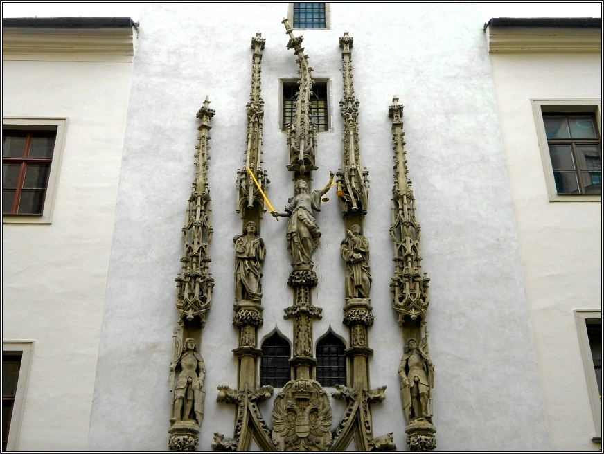 Одна из них рассказывает, почему искривлена башенка на портале ратуши. Городской совет поручил создание портала ратуши известному мастеру Антонину Пилграму, обучавшемуся в своё время в Праге. Власти пообещали Пилграма достойно вознаградить его за труд, но обещания не сдержали. Мастер закончил работу, но центральную башенку портала нарочно изогнул.