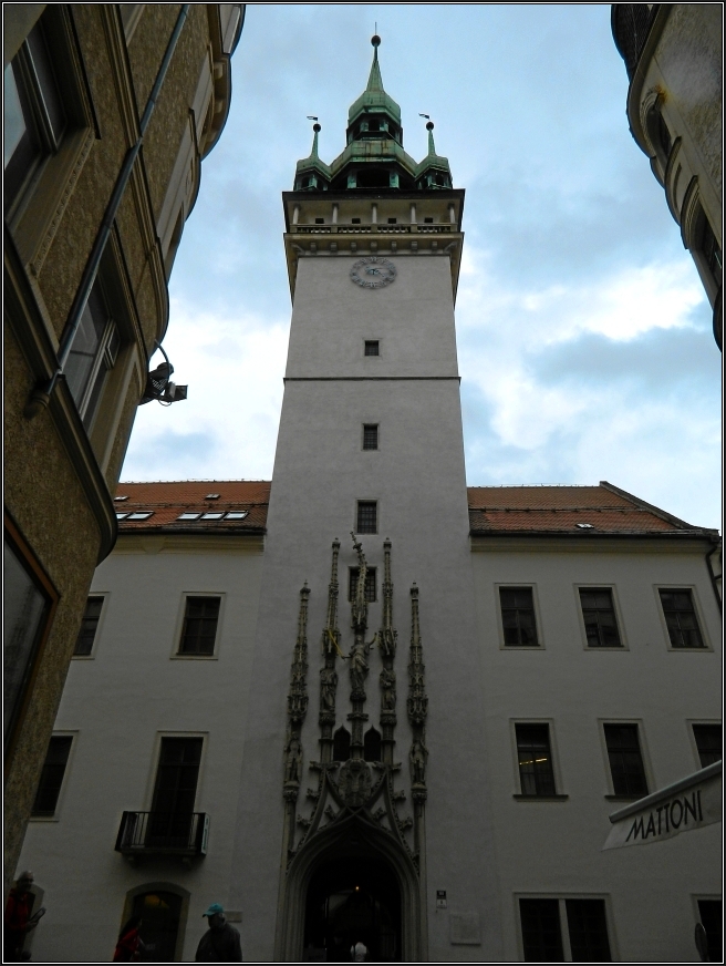 Одна из главных достопримечательностей Брно — старая ратуша. Она действительно старая — в качестве ратуши она использовалась с 14 века и до 1935 года. Вид на ратушу с площади Zelný trh (Овощной рынок).