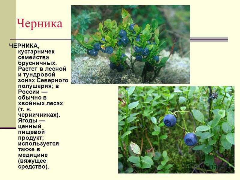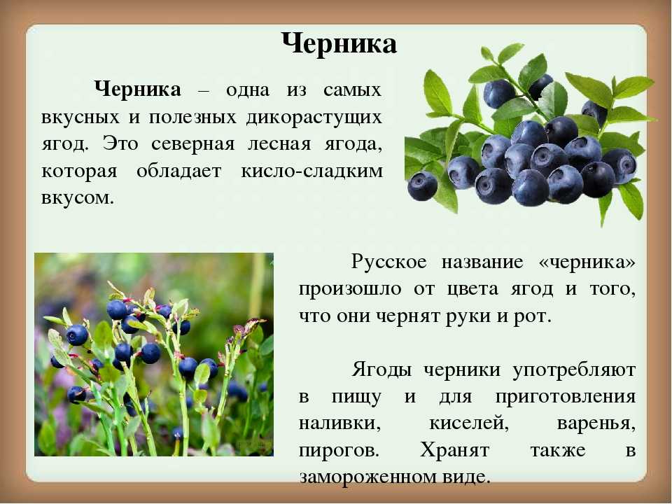 У черники существует много других названий: голубая ягода, ворон-ягода, вороний глаз, черная ягода, росяная ягода, миртова ягода, чернуха, чернега, чернижник, черница, черничник, чернишник. Род Черника насчитывает около 100 видов. На территории СНГ встречается всего 7 видов, среди которых наиболее распространены: черника кавказская, черника волосистая, черника овальнолистная и черника красная. Черника кавказская (V. arctostaphylos L.), растущая на Кавказе – самый крупный из представителей рода Черника. Это крупный кустарник или небольшое деревце высотой до 3 м, образующее по склонам гор иногда обширные труднопроходимые заросли. Черника волосистая (V. hirtum Thunb.) встречается в хвойных лесах на Сахалине, а также в Японии и Северной Америке. На о-ве Кунашир, Командорских о-вах и в Уссурийском районе на болотах, в лесах растет, черника овальнолистная (V. ovalifolium Smith), в зарослях стланика на Камчатке и в Уссурийском районе растет черника красная, или красника (V. рrаestans Lamb.