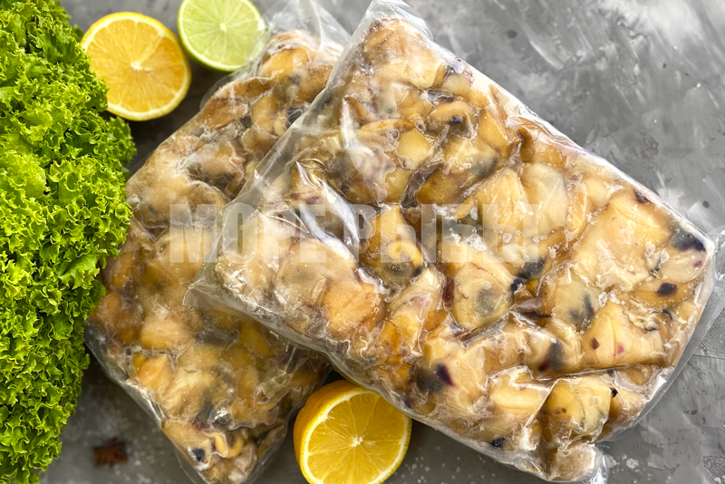 Мякоть рапаны перед приготовлением надо разморозить, вымыть и освободить от жестких краешков и пищеварительных органов, чтобы остался один только кремового цвета мускул — «нога». Режем мякоть моллюска на кусочки.