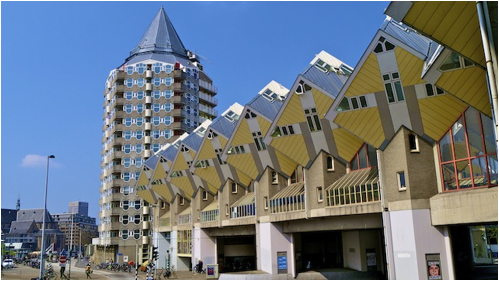 Кубические дома.Кубические дома, как можно догадаться из названия, представляют собой комплекс жилищ в форме куба. Этот причудливый и эксцентричный проект был разработан Питом Бломом, а кубы, из которых состоит комплекс, наклонены под углом 45 градусов.