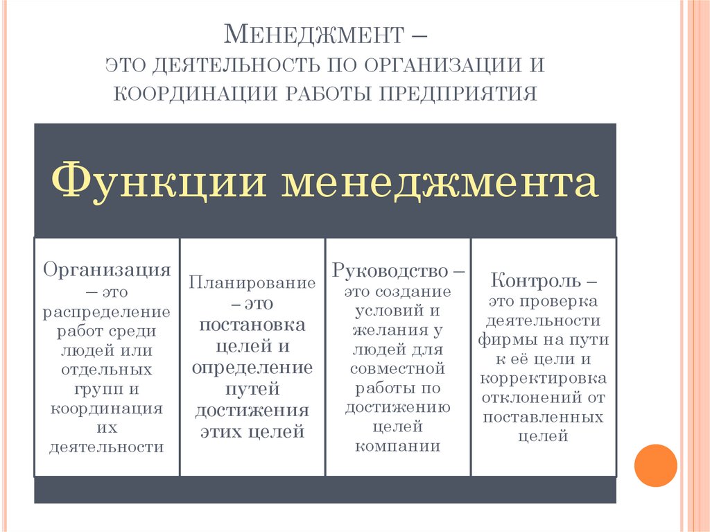 - Предприятие и организация — сложный хозяйственный организм. В процессе производства необходимо организовать четкие экономические связи между отдельными подразделениями, службами с целью обеспечения единства их действий и эффективности работы коллектива путем реализации функций, обусловленных движением всего производственного организма в отличие от движения отдельных его частей.