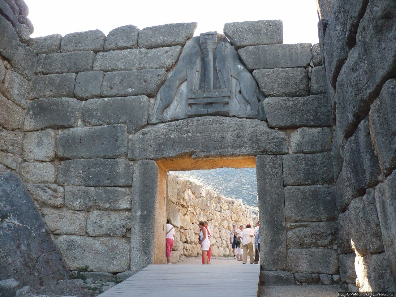 Войти в Микенскую крепость (лето: понедельник 12:30 19:30, вторник-воскресенье 8:00-19:30; зима: 8:30-17:00; 8 €) можно через знаменитые Львиные ворота. Большой интерес вызывают грандиозные стены, толщина которых местами достигает 6 метров и сложены они из камней огромных размеров. Стены называют «циклопическими»: эллины полагали, что соорудить подобное по силам лишь каким-то легендарным существам, например, циклопам – не смертным людям. Над воротами – резной рельеф изящной работы.