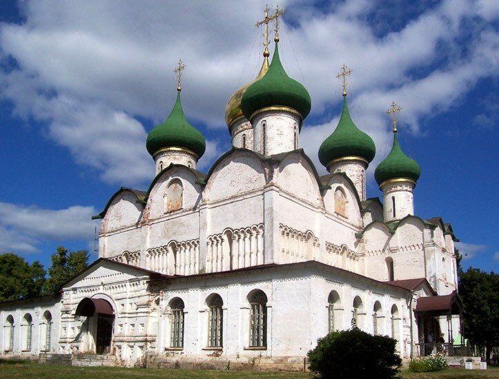 Собор Рождества Богородицы, чьи голубые купола, усыпанные золотом, возвышаются над парадным двором Суздальского кремля, был основан в 1220-х годах. Однако только его богато вырезанная нижняя часть представляет собой оригинальный белый камень; остальное — кирпич 16 века.Внутри роскошно, с фресками 13-го и 17-го веков и дамасскими (золото на меди) западными и южными дверями 13-го века.