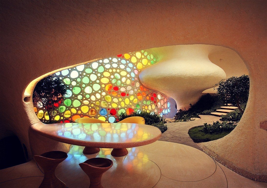 - Прямых углов в доме-ракушке нет вообще, все линии округлые и плавные, а разноцветные витражные окна округлых форм создают потрясающую игру световых отблесков.