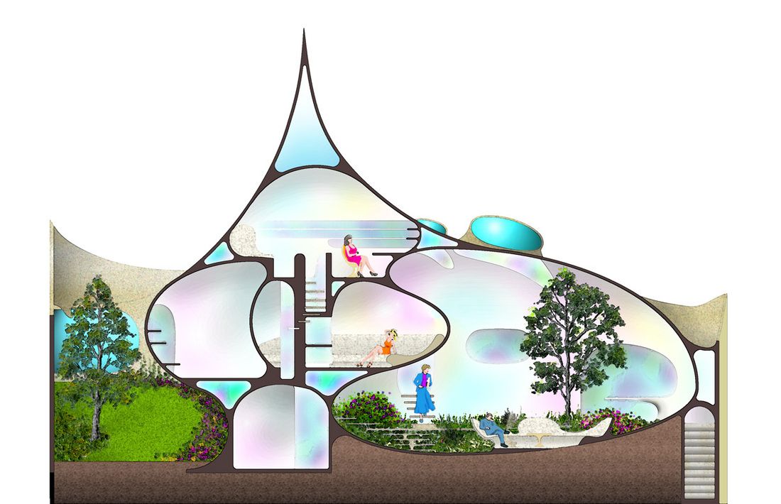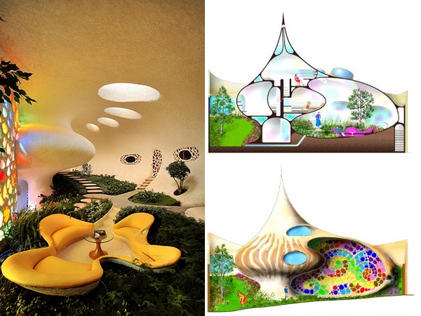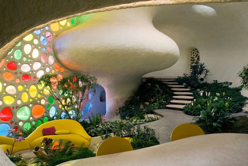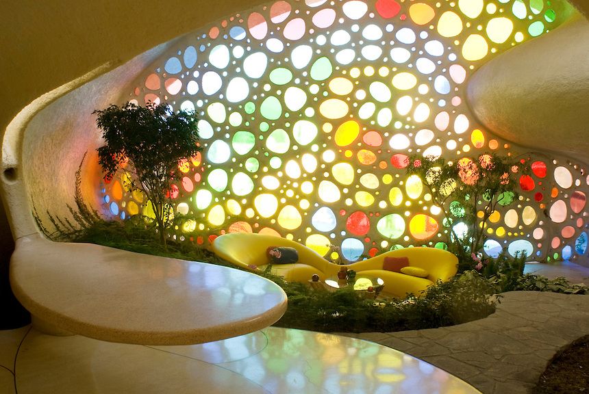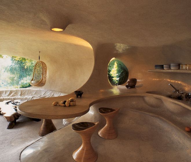 Заземление, стены, полы, потолки и мебель работают как 4 на 5 см. толстая ферроцементная яичная скорлупа, придающая жесткость конструкции, имеет основную форму в виде непрерывной спирали, двойной кривизны.