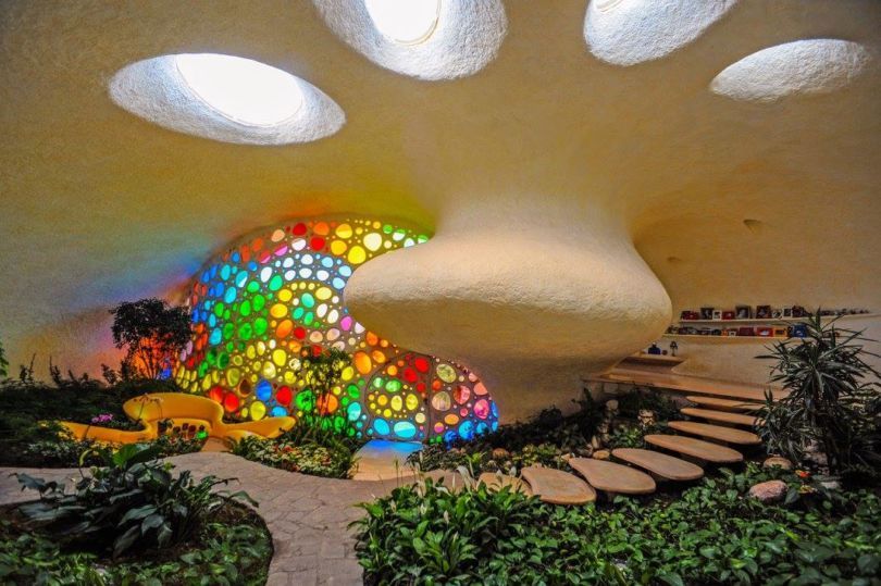 - Прямых углов в доме-ракушке нет вообще, все линии округлые и плавные, а разноцветные витражные окна округлых форм создают потрясающую игру световых отблесков.