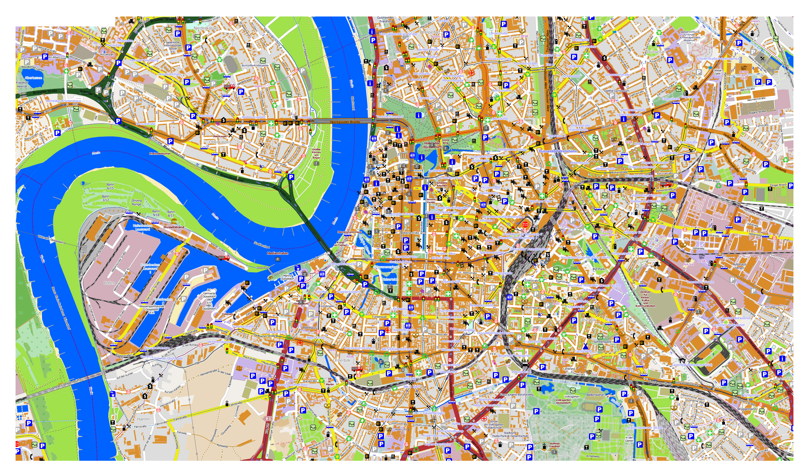 интерактивная карта Дюссельдорфа с достопримечательностями и другими туристическими объектами — незаменимый помощник в самостоятельном путешествии. Например, в режиме «Карта», иконка которого находится в левом верхнем углу, вы можете увидеть план города, а также подробную карту дорог с номерами маршрутов. Вы также можете увидеть железнодорожные вокзалы и аэропорты города, отмеченные на карте. Рядом вы видите кнопку «Спутник». Включив спутниковый режим, вы будете рассматривать местность, а увеличив масштаб, сможете изучить город в мельчайших деталях (благодаря спутниковым картам от Google Maps).
