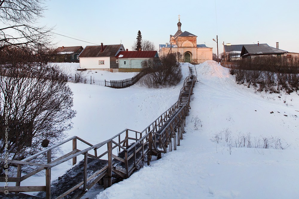 на месте одноименного деревянного храма, известного с 1512 г. Перекликается с ансамблем Клобукова монастыря, задавая тон в панораме северо-восточной части города. От каменной колокольни нач. XIX в. сохранился только нижний ярус. Ныне не действует.