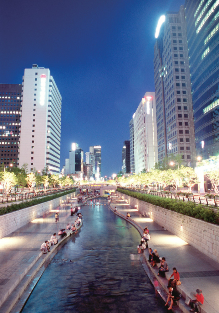 По обеим сторонам ручья тянутся живописные дорожки, усаженные растениями и деревьями. Вечерами уличные танцоры и актеры устраивают представления со световыми эффектами, необыкновенно красиво освещающими воду. В поисках умиротворенного места приходите к ручью Чхонгечхон с его уединенными аллеями, где вас ждет беззаботная прогулка по городу.