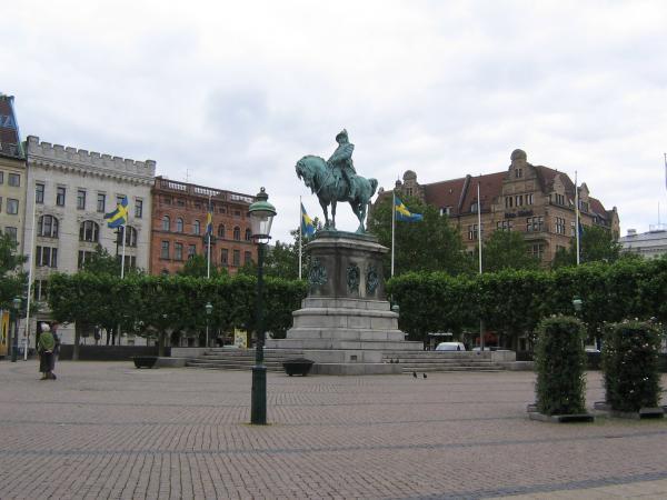 В центре площади впечатляющая статуя короля Карла Густава X выступает в качестве ориентира и помогает туристам ориентироваться на площади, когда они посещают все магазины, расположенные в этом районе.