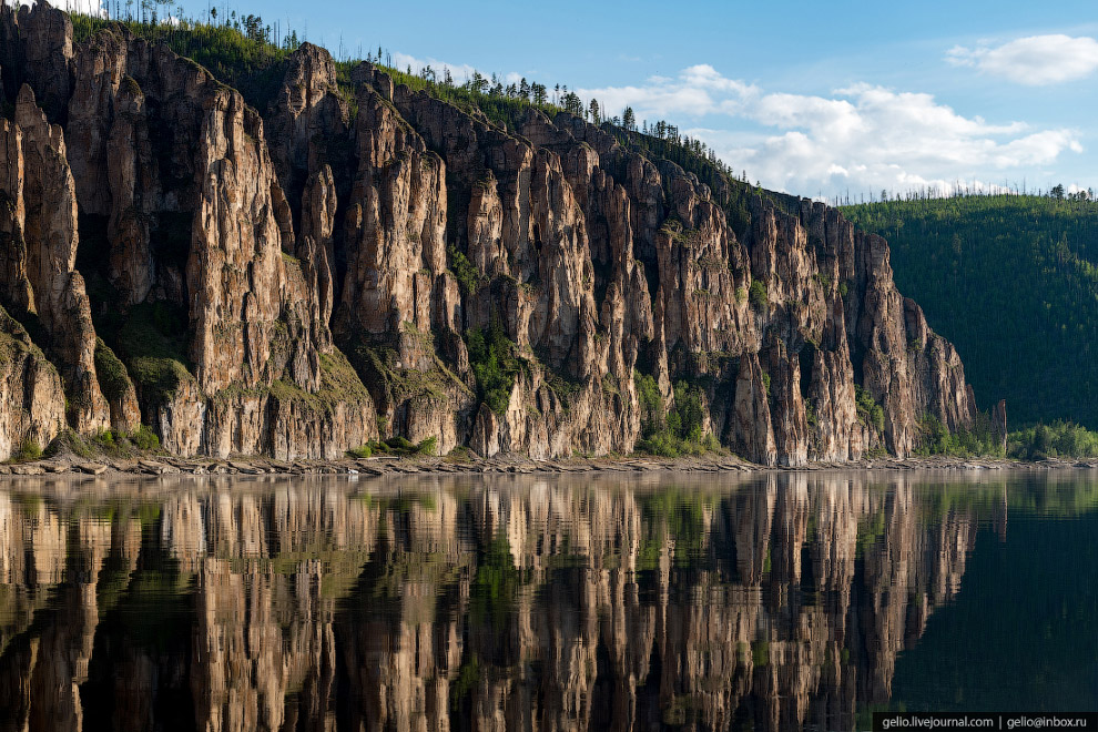Эти вертикальные отвесные скалы высотой до 100 метров находятся недалеко от знаменитых Ленских столбов. Тянутся они на 80 км вдоль берега реки Синей, одного из притоков Лены. Они не столь знамениты, как Ленские, но ничуть не уступают им по красоте. Возраст известняковых столбов, по примерным оценкам, около 400 тысяч лет. За это время дожди, ветер и стекающая с вершин вода сотворили замысловатые формы скал, напоминающие башни, арки, каменные мосты и дворцы.
