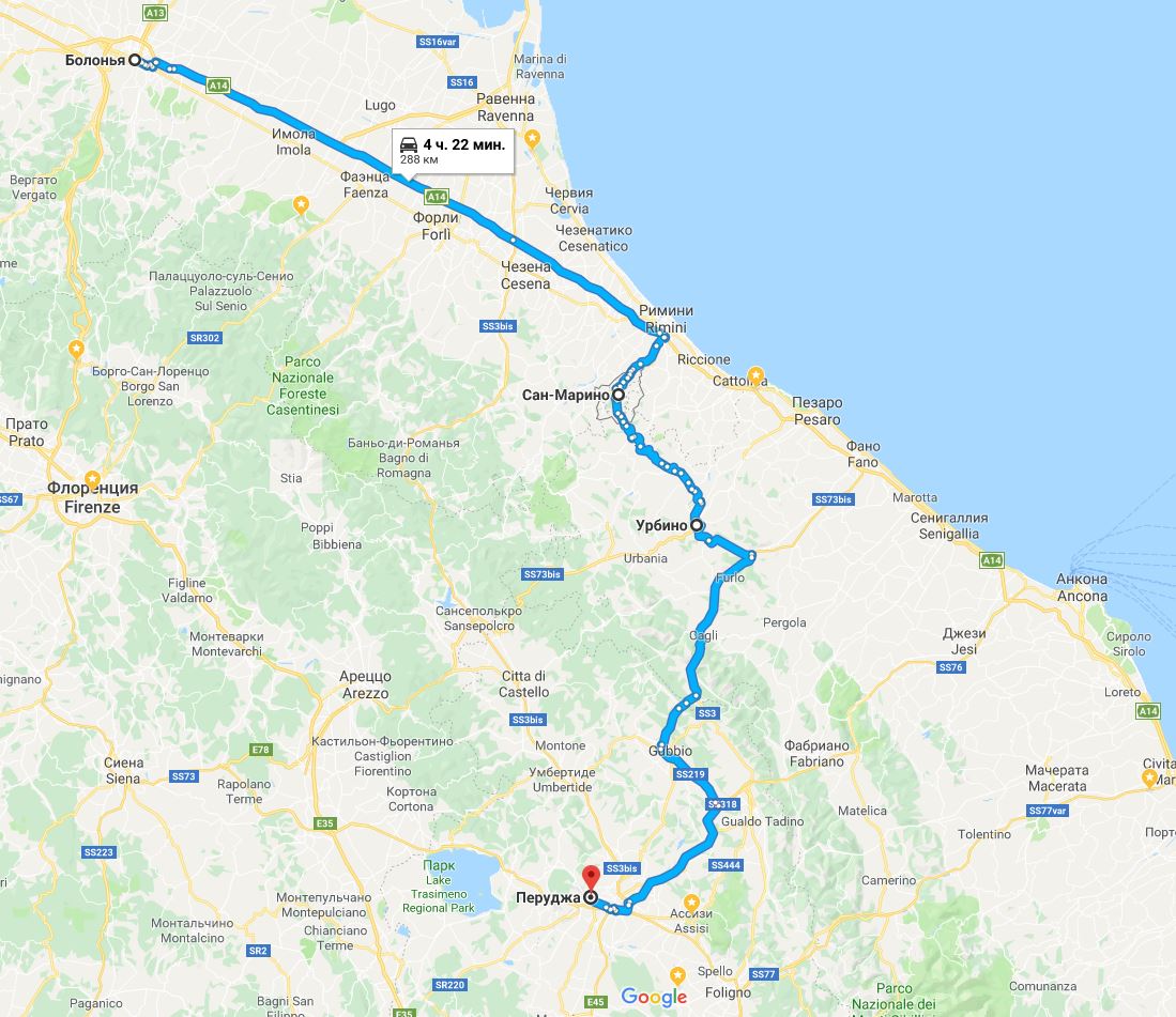 Возможность проложить маршрут по территории страны и рассчитать расстояние — инструмент «Линейка», узнать протяженность города и путь к его центру, адреса достопримечательностей, остановки транспорта и больницы (тип схемы «Гибрид»), посмотреть вокзалы и границы области Эмилия-Романья.