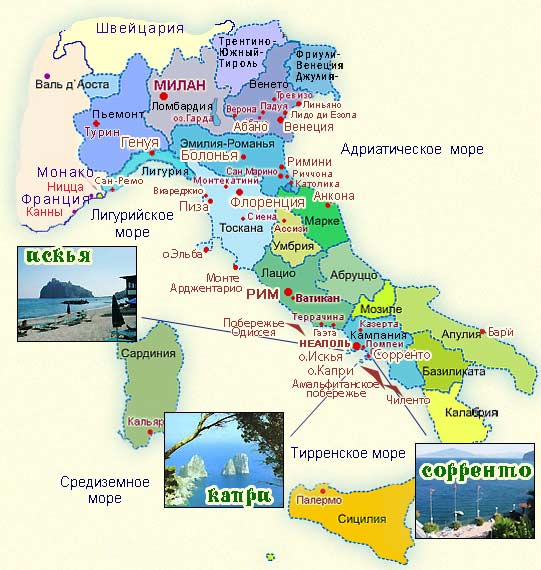 Карта ИТАЛИИ с городами и курортами представлена ниже. Чтобы увидеть карточку полностью, нажмите на нее, и она откроется в новом окне. Также его можно распечатать и взять с собой в дорогу.