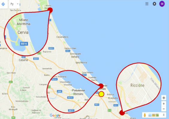 Интерактивная карта Римини с достопримечательностями и другими туристическими объектами — незаменимый помощник в самостоятельном путешествии. Например, в режиме «Карта», значок которой находится в левом верхнем углу, вы можете увидеть план города, а также подробную карту автомобильных дорог с номерами трасс. Также вы можете увидеть отмеченные на карте ж/д вокзалы и аэропорты города. Рядом вы видите кнопку «Спутник». Включив спутниковый режим, вы рассмотрите рельеф местности, а увеличив изображение, сможете очень подробно изучить город (благодаря спутниковым картам от Google Maps).