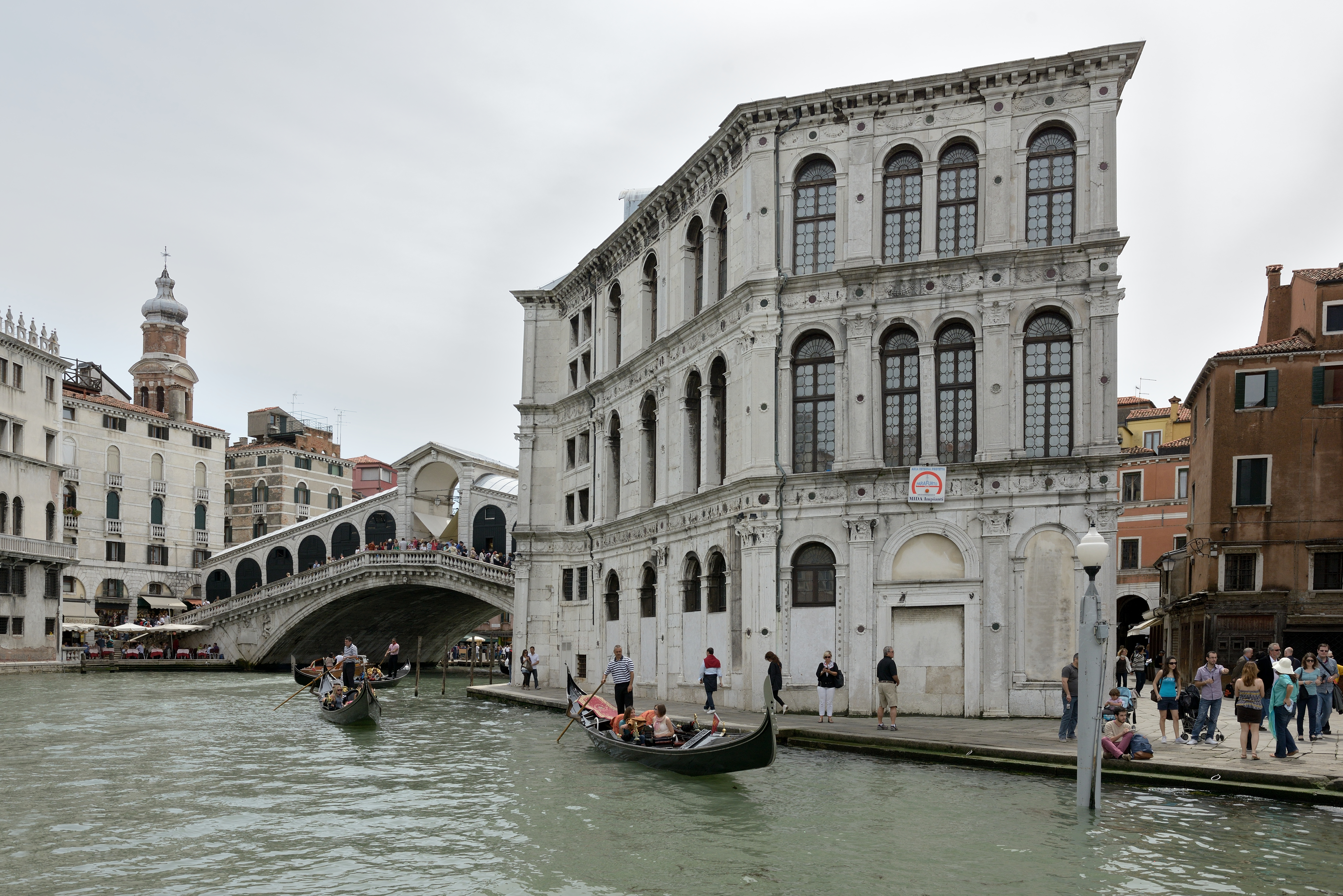 Обратите внимание на великолепный белый дворец, возвышающийся над соседними постройками. Возведенное в эпоху Ренессанса, здание приобрело современный вид в 1575 году. Палаццо притягивает взгляды туристов фасадом из столь любимого венецианцами разноцветного мрамора и интерьерами, украшенными фресками итальянских живописцев.
