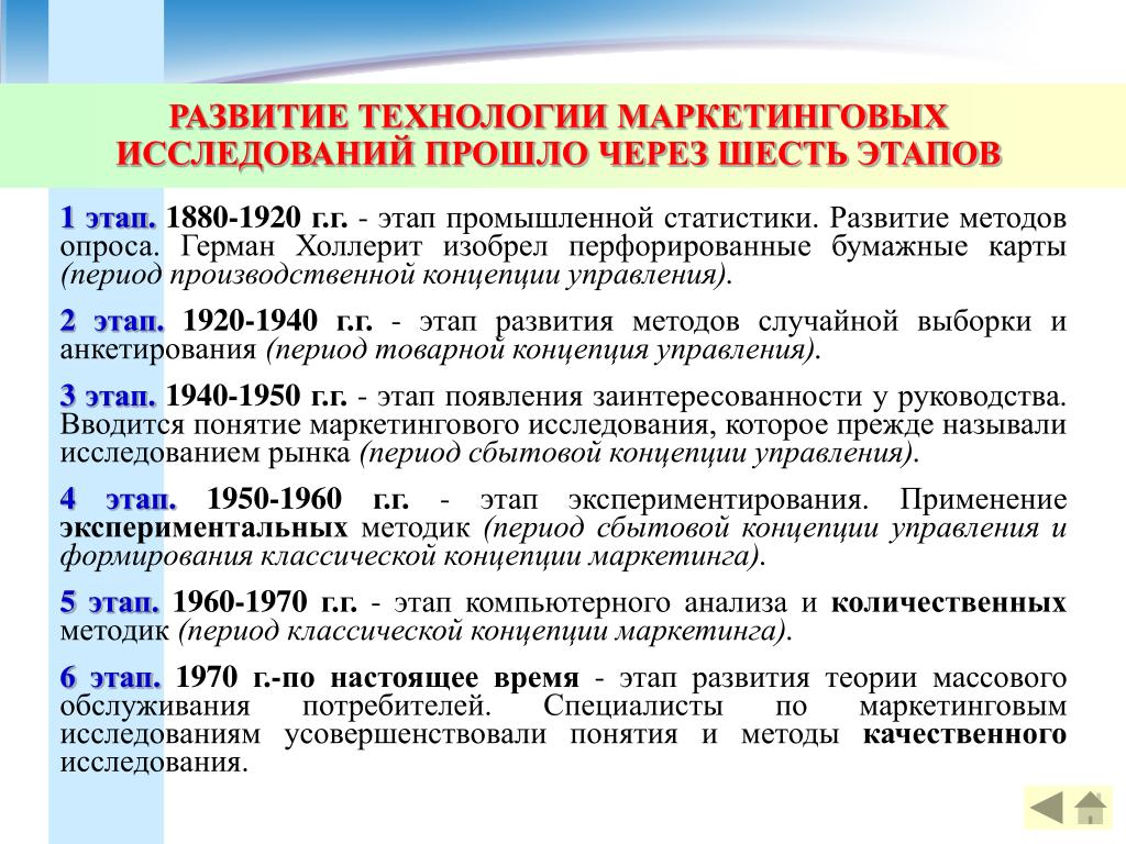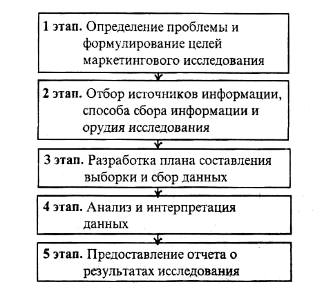 Маркетинговые исследования обычно включают пять основных этапов: 1) выявление проблем и формулирование целей исследования; 2) отбор источников информации; 3) сбор информации; 4) анализ собранной информации; 5) представление полученных результатов.