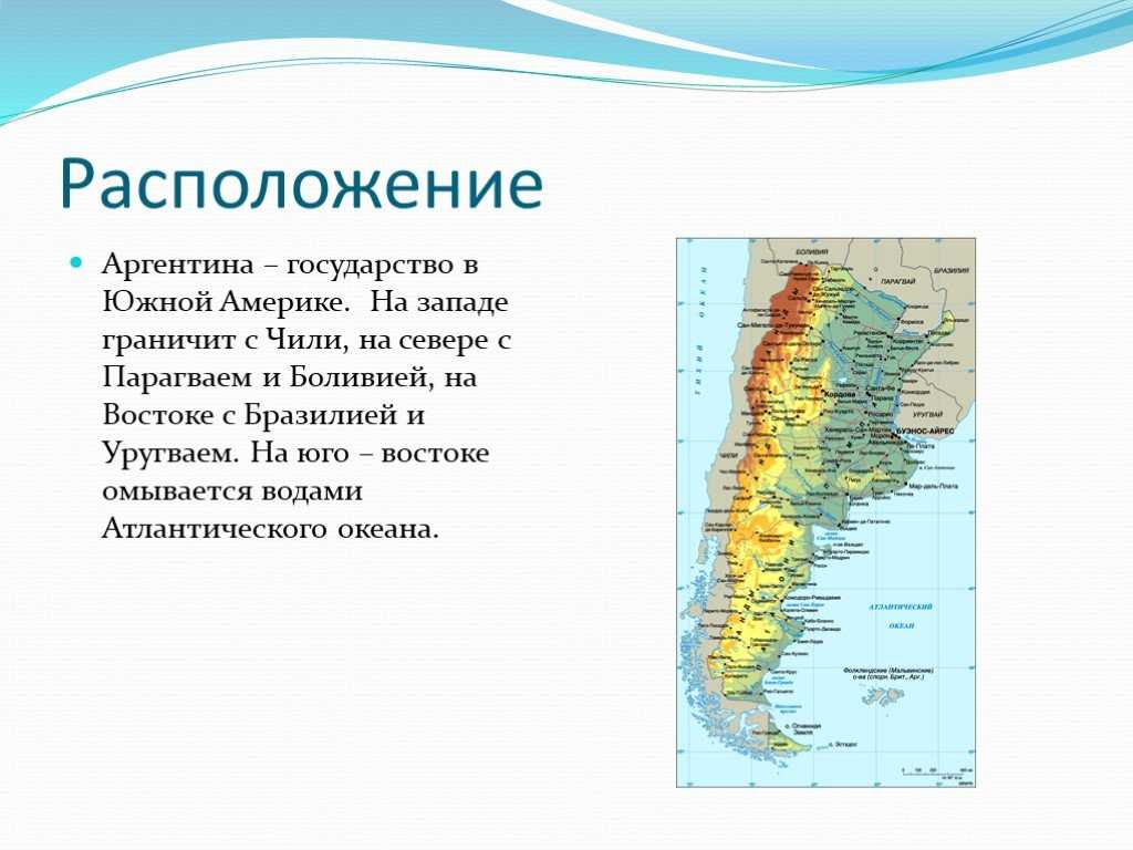 - Аргентина расположена на юге Южной Америки и граничит с Чили на западе, Боливией и Парагваем на севере, а также с Бразилией и Уругваем на северо-востоке.