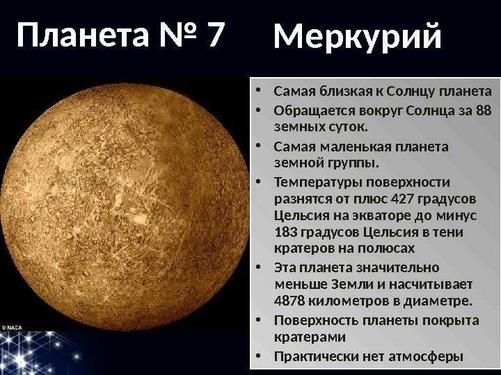 1. Диаметр Меркурия составляет 4880 км. Это самая маленькая планета Солнечной системы. Спутник Юпитера Ганимед и спутник Сатурна Титан больше Меркурия.