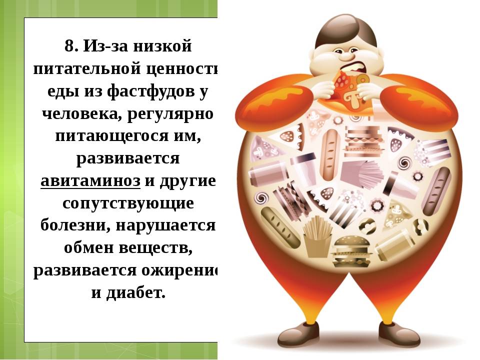 Употребление «быстрой пищи» вызывает дисбаланс жиров, белков и углеводов, способствует ожирению. В результате длительного приема такой пищи сильно страдает эндокринная система.