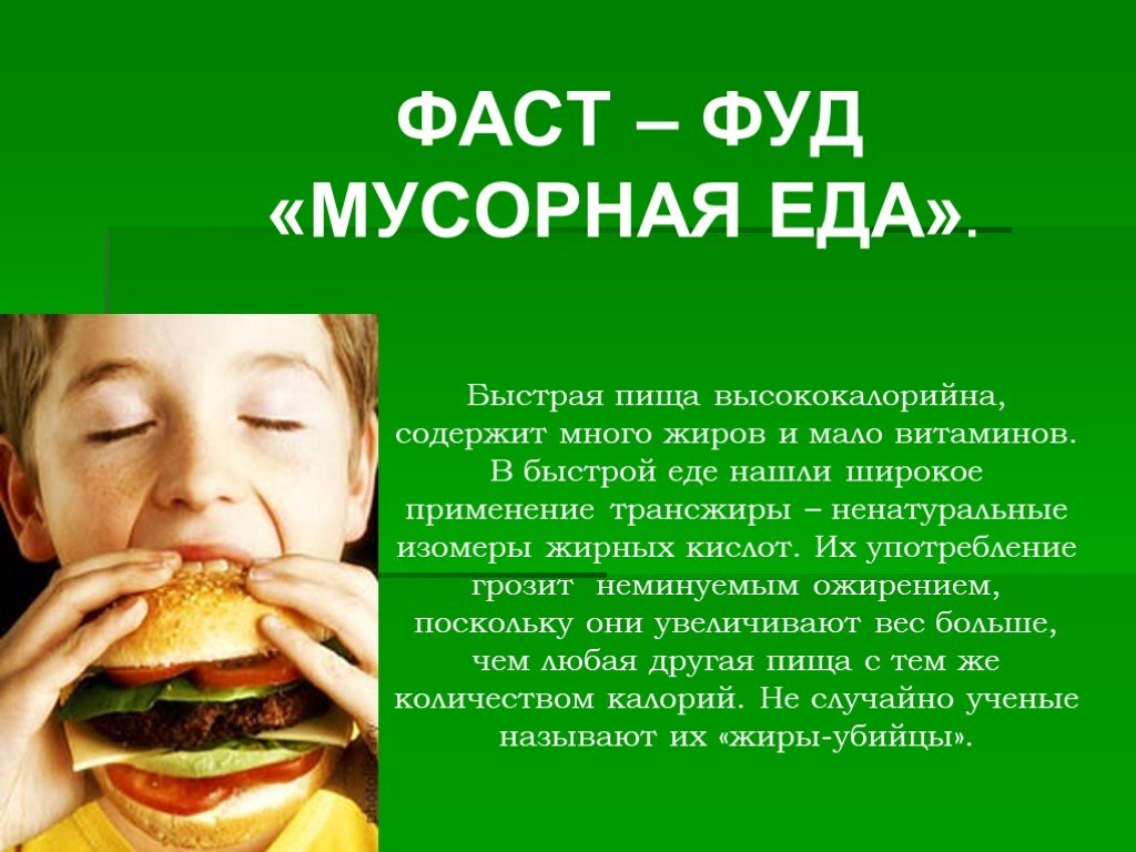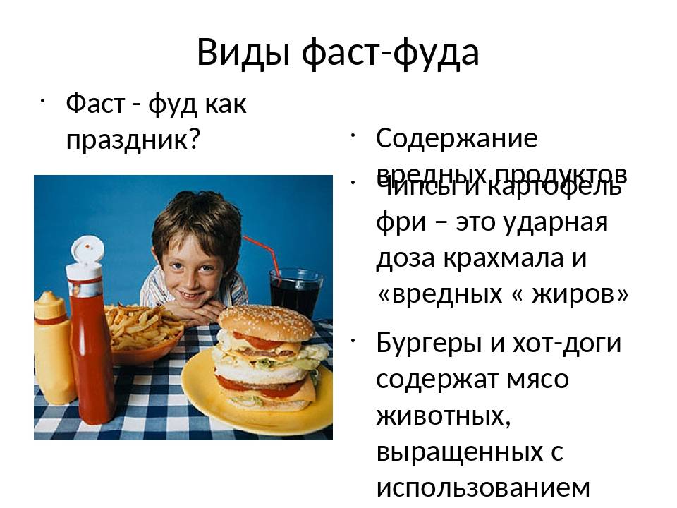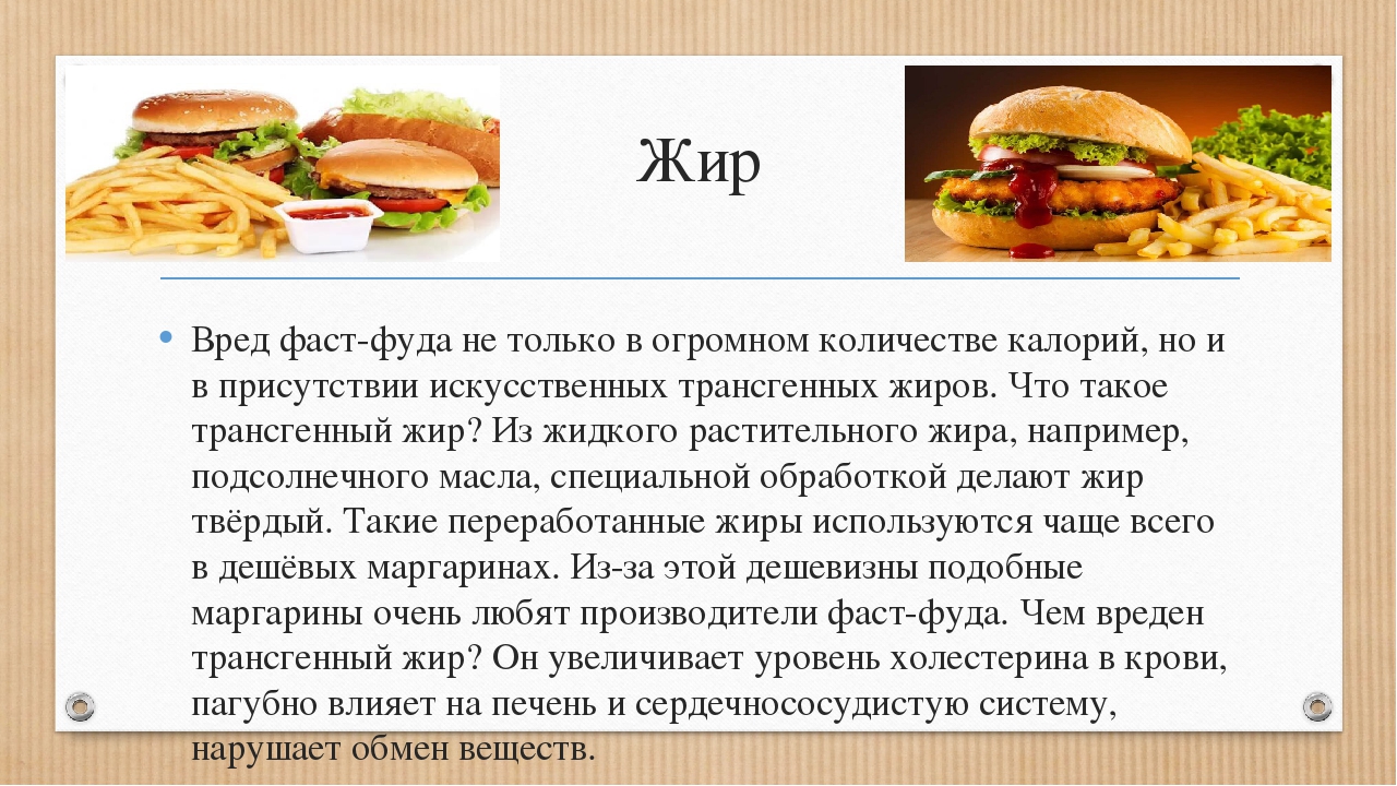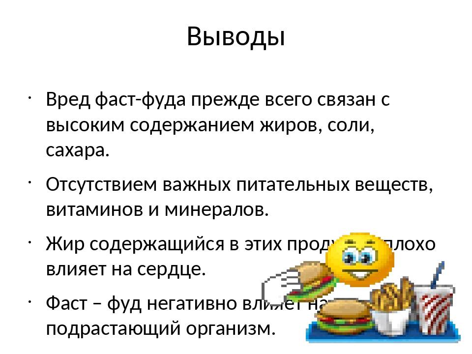 Фаст-фуд часто содержит много калорий, жиров и сахара, но мало питательных веществ и клетчатки. Хотя иногда употребление фаст-фуда не является проблемой, его частое употребление может повысить риск ожирения, сердечного приступа и других проблем со здоровьем.