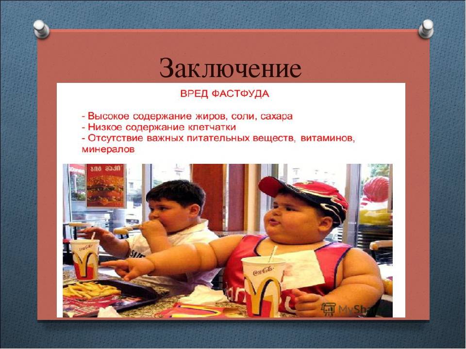 В результате увлечения фаст-фудами с каждым днем увеличивается число людей, больных ожирением. Особенно страдают от такого питания дети, так как растущему организму крайне необходимы все полезные вещества для нормального функционирования организма.