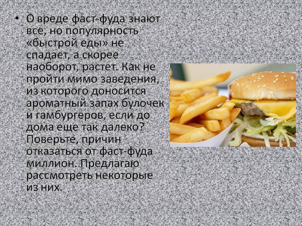 Фаст-фуд становится все более и более популярным с каждым годом. Эта пища легкодоступна, быстро готовится, удобна и, в общем-то, вкусна. В оживленном графике современных людей абсолютно нет времени на приготовление пищи, так как большая часть дня проводится на рабочем месте…