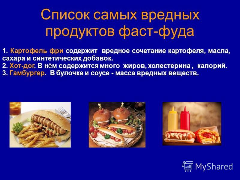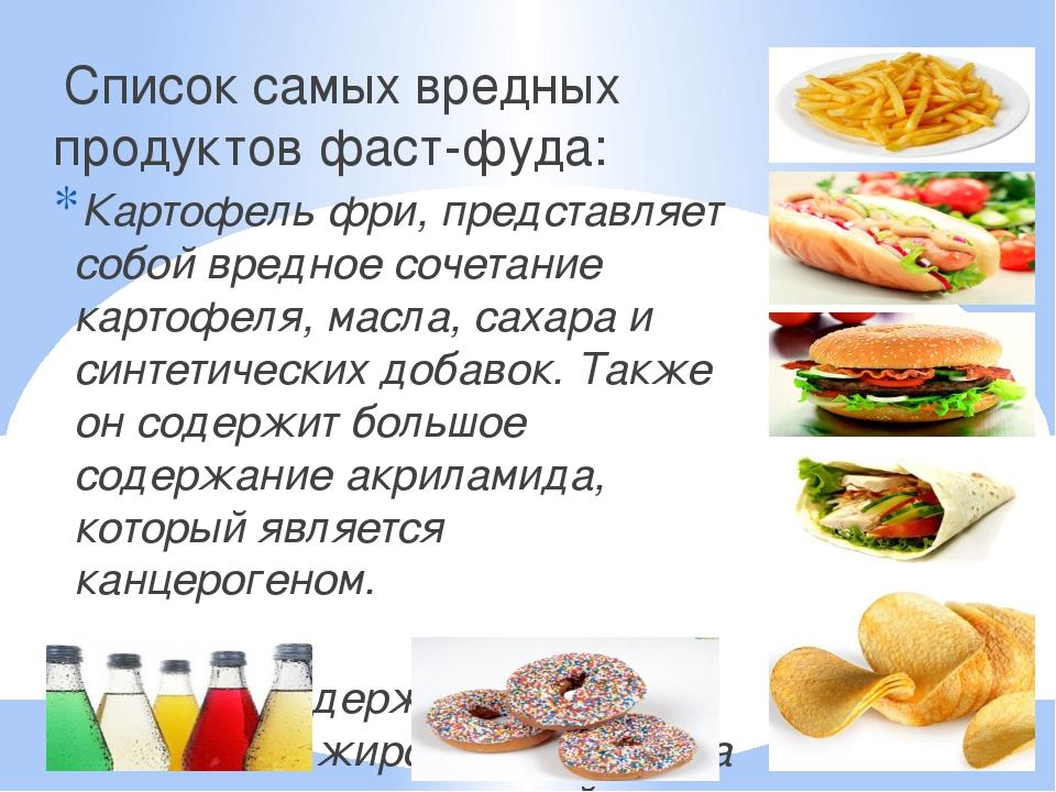 2.Составить список самых вредных продуктов фаст-фуда.