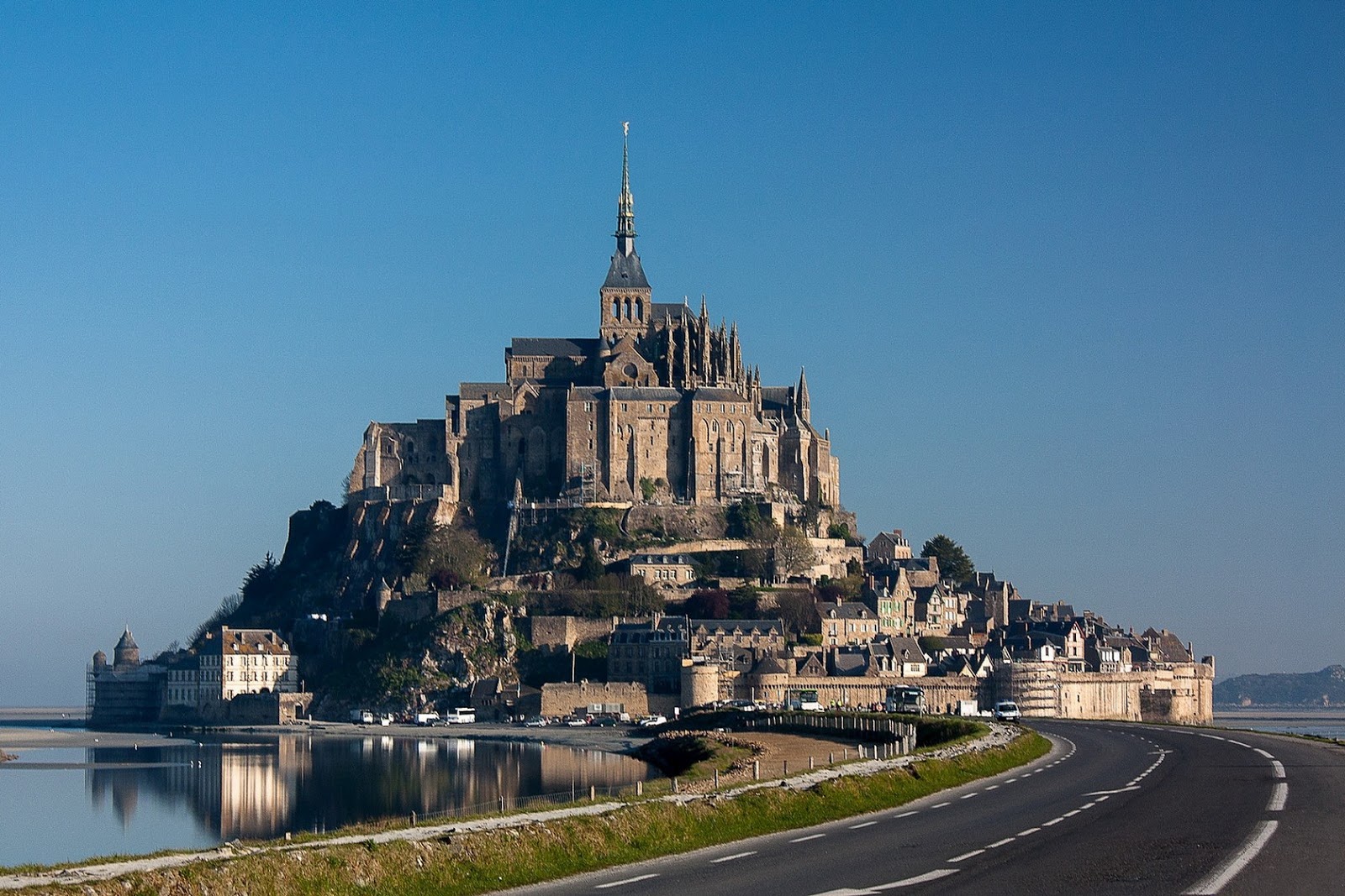 Во время прилива дорогу к аббатству полностью скрывает вода, и перед вами открывается фантастический вид: словно из моря вырастает крепость.