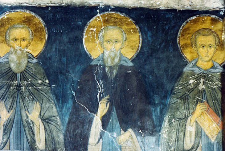 На алтарной преграде, между иконами деисусного чина и местного, иконы которого размещались в киотах, мастера вписали полуфигуры преподобных, почитавшихся на Руси. Размещение подобных изображений на глухой алтарной стене было известно по другим русским памятникам: звенигородским храмам первой трети XV века – церкви Успения на Городке и собору Саввино-Сторожежского монастыря. Для нового Успенского собора Дионисий в 1480-х годах написал две, парные, житийные иконы московских митрополитов Петра и Алексия.Эти иконы являются первыми житийными иконами московских чудотворцев и созданы на основе глубоко продуманной и детально разработанной программы. Им отводилась одна из ключевых ролей в декорации нового собора, пока он не был полностью расписан в 1513-1515 годах. В настоящее время икона «Митрополит Петр с житием» демонстрируется в Успенском соборе Московского кремля, для которого и была написана, а «Митрополит Алексий с житием» в Государственной Третьяковской галерее.