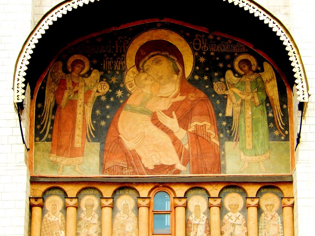 Первый кремлевский Успенский собор, представляющий собой простое одноглавое каменное сооружение, был построен московским князем Иваном I Даниловичем в 1327 году как резиденция главы Русской православной церкви митрополита. Питер. В 1472 г. митрополит Московский Филипп решил заменить старую церковь, заложив камень великим князем Иваном III (годы правления 1462–1505), но в 1474 г. новое здание было разрушено землетрясением, не успев достроиться. Затем Иван нанял итальянского архитектора Аристотеля Фиораванти, поручив ему смоделировать свою церковь по образцу Успенского собора тринадцатого века во Владимире, полагая, что прототип был спроектирован самой Марией. Фиораванти взял традиционную пятиглавую структуру, округлые ниши и декоративные аркады, но добавил ренессансные пропорции и технику, «по своему хитрому умению», как сообщает летопись, «не на манер московских строителей». Церковь стала образцом для ряда других важных соборных и монастырских церквей, например, в Новодевичьем монастыре и Троицком монастыре. Сергиев монастырь.