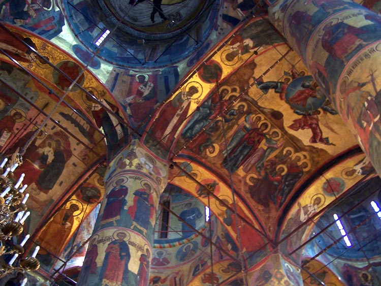 «священных знаков» фрески либо переписывали полностью в технике, исключающей применение «альфреско», т. е. яичной темперой, клеевыми красками или — с XVII в. -маслом, либо поступали более радикальным образом, и это хорошо видно из истории стенописей Успенского собора.