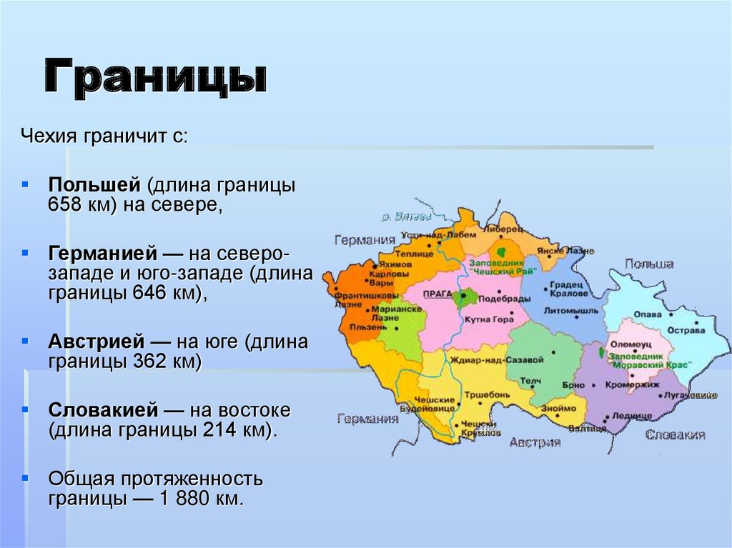 Чешская Республика, граничащие со странами : Словакия, Германия, Австрия, Польша.